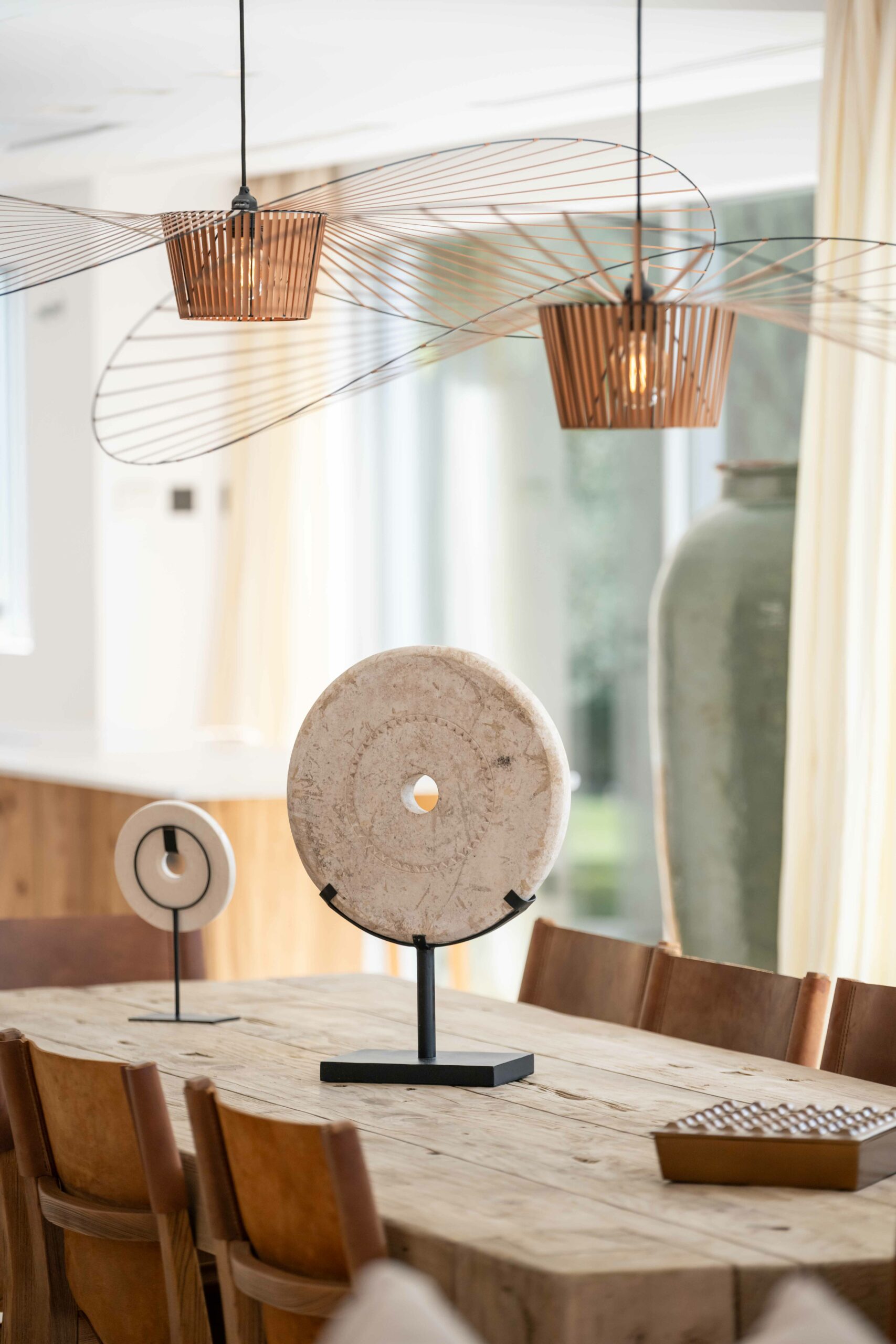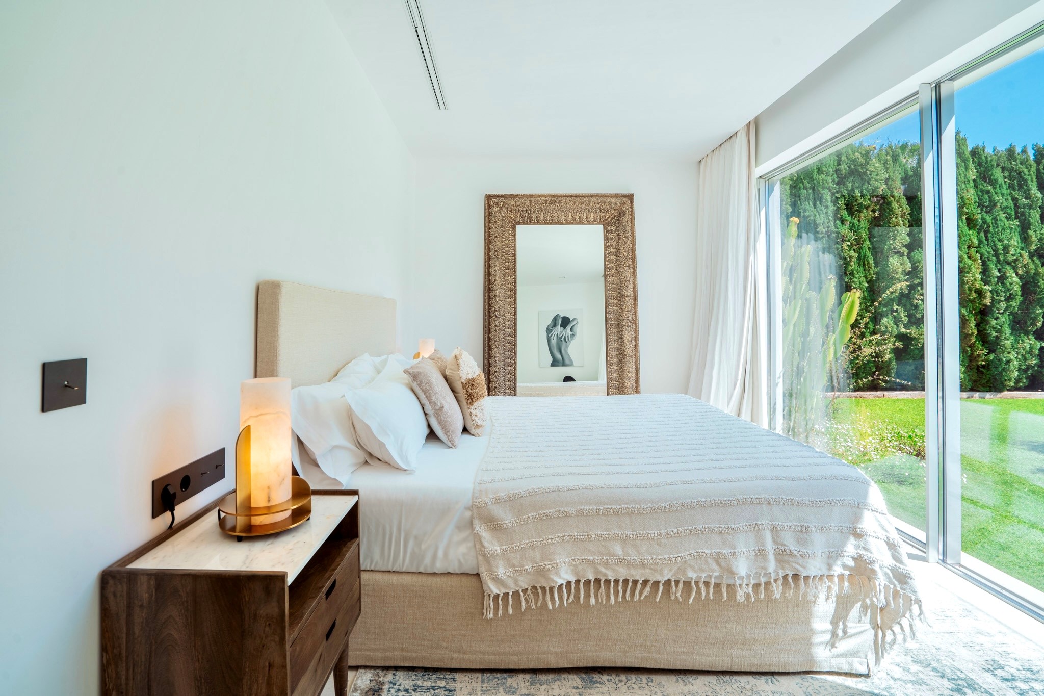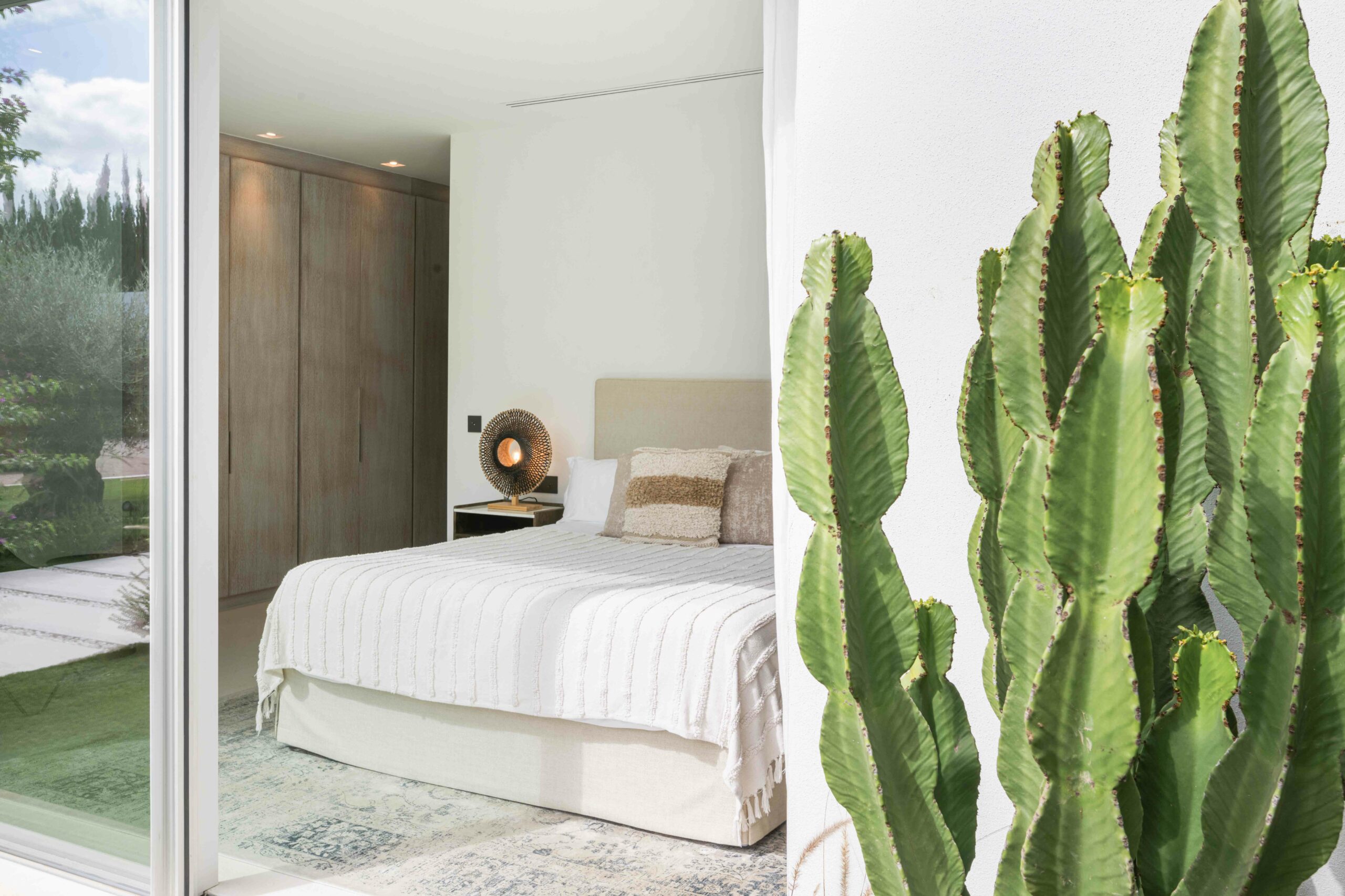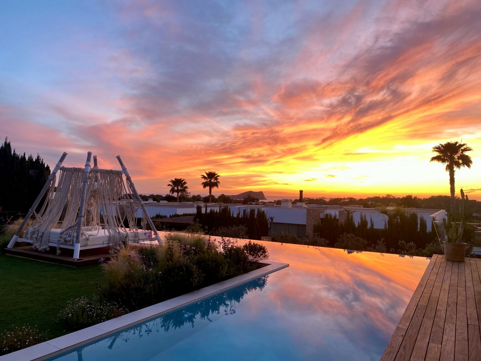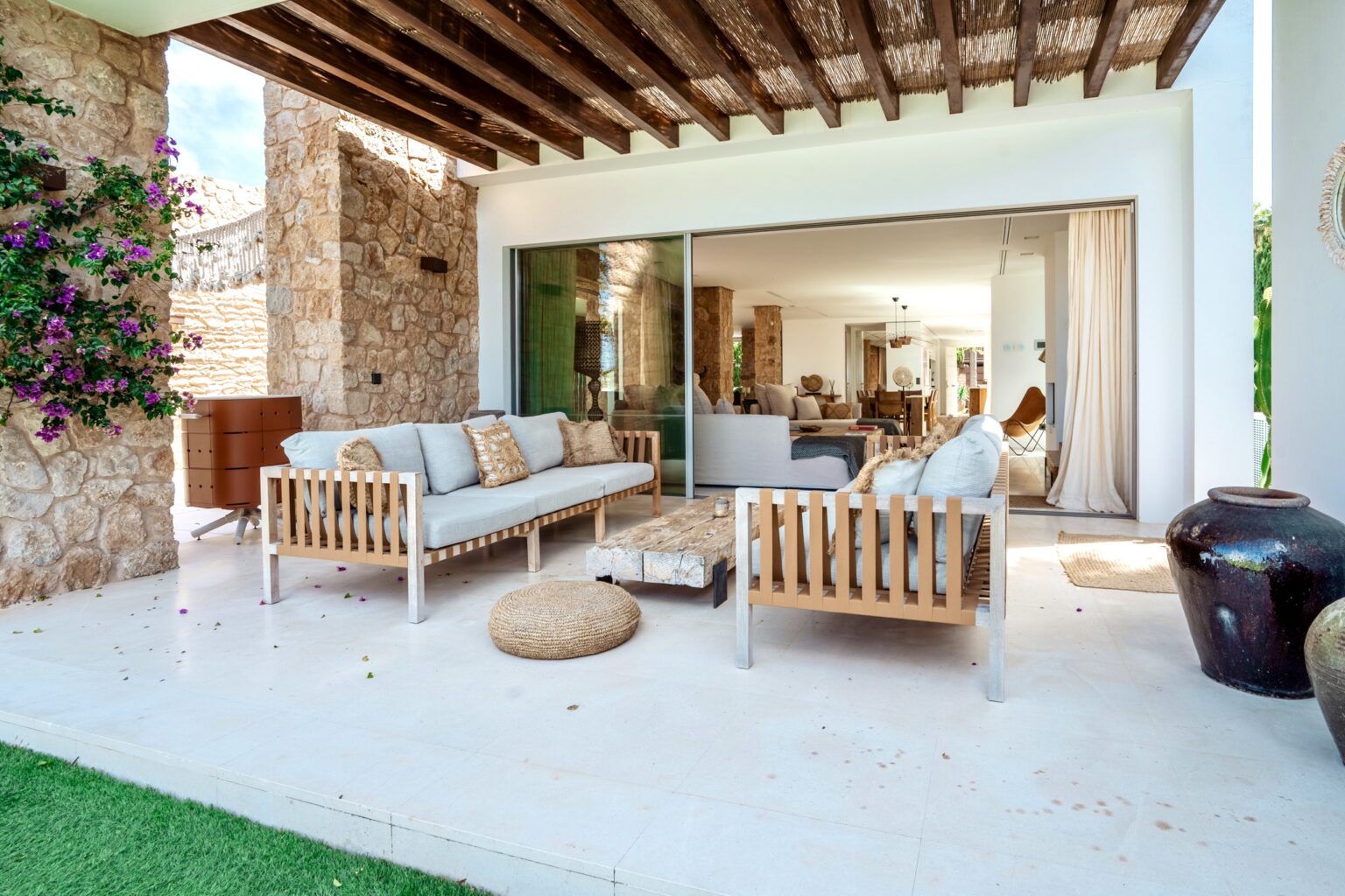 open plan, beautifully designed dining room with solid wood and leather chairs from the designer Timothy Oulton –London, leads onto the lounge area where you can sit back and relax on the stylish sofas by the famous Gervasoni, enjoying the Apple TV system or simply chill out listening to some classic Balearic beats on the Bang and Olufsen sound system, while relaxing in the authentic leather AA Butterfly armchair. You can relax and enjoy the view onto the garden, terraces, and pool area with a backdrop of the sea and the spectacular sunsets.