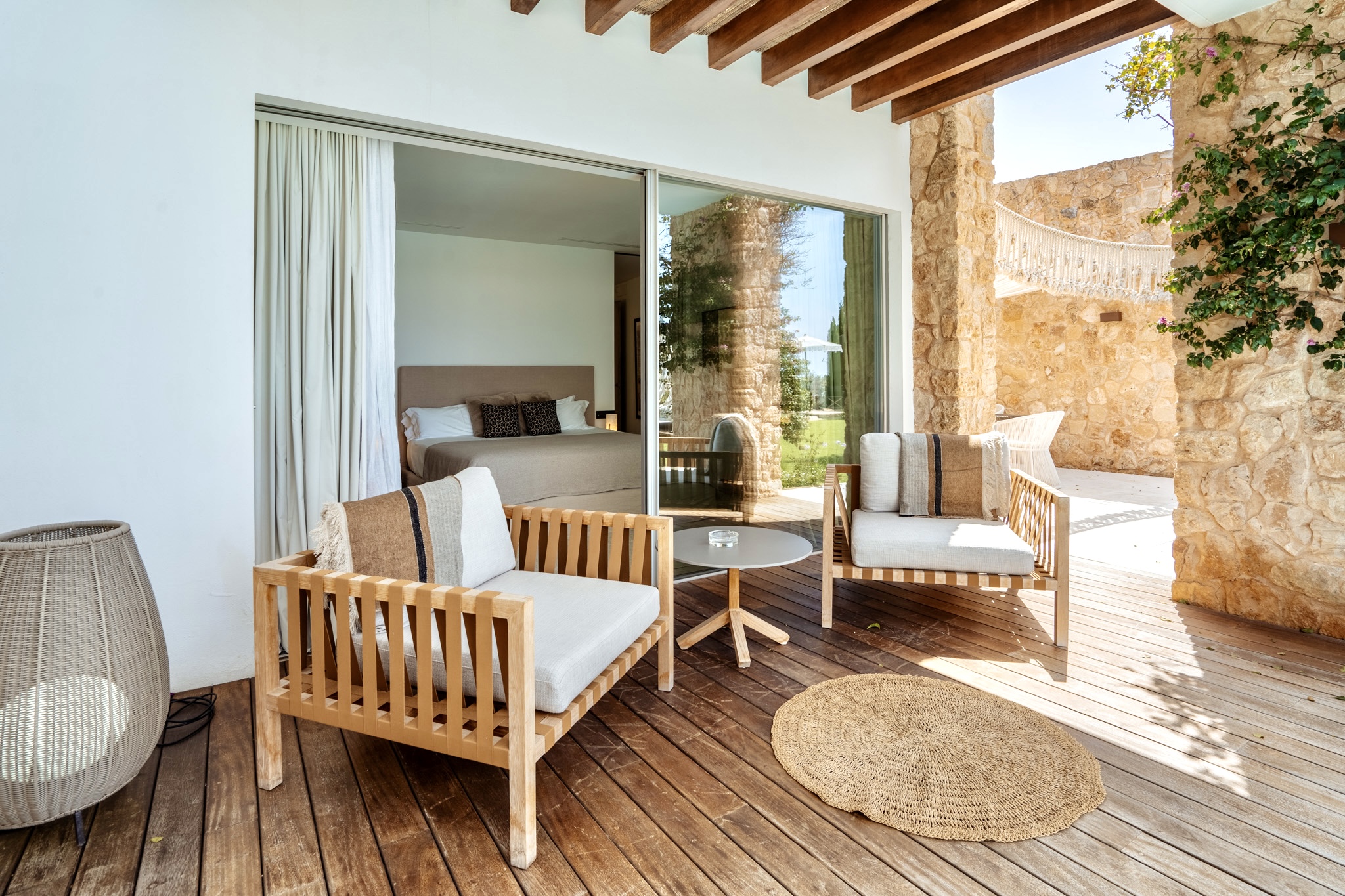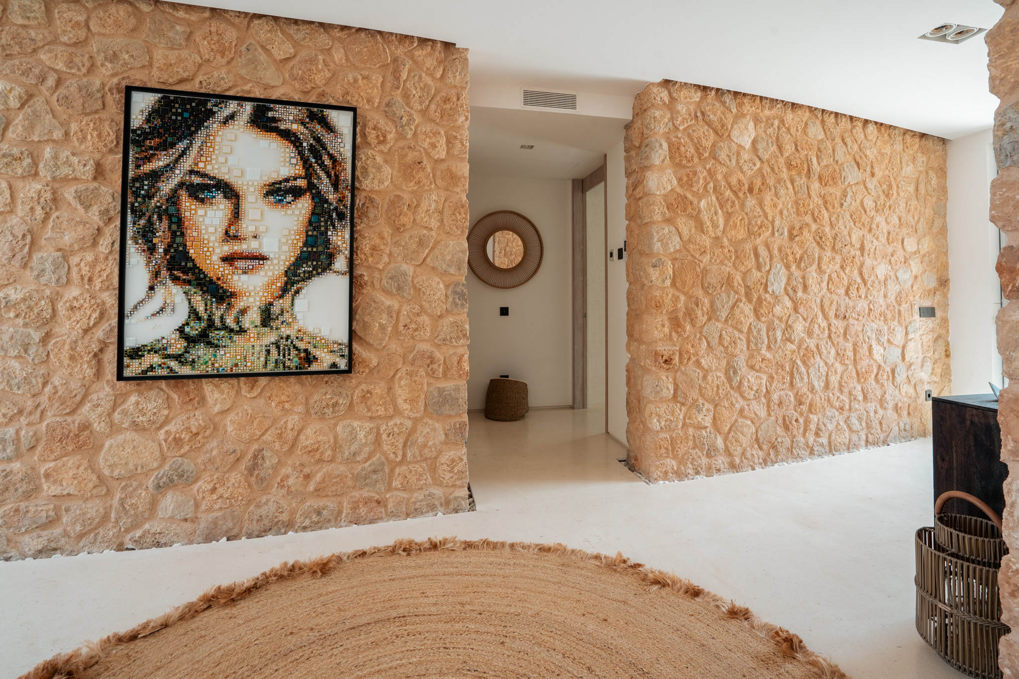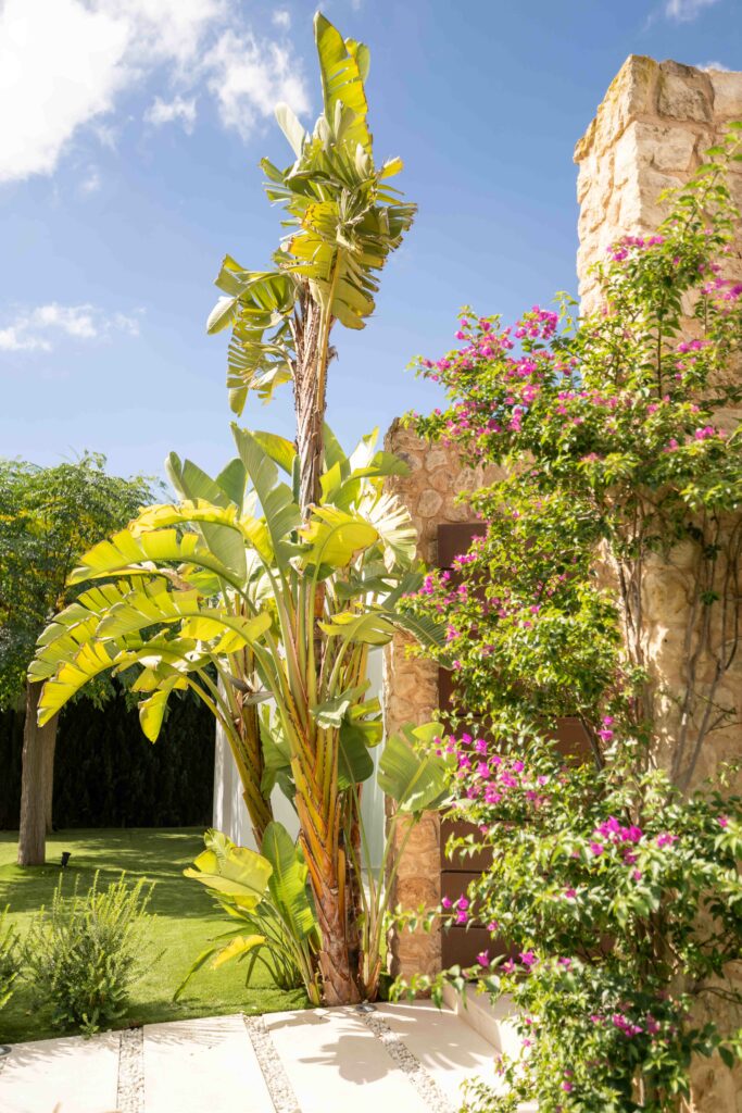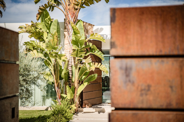 The architects have achieved to design this villa in a way that blends natural stones from the island, the typical Ibiza style walls and the contrast of the oxidized metal finish on the exterior gates.
