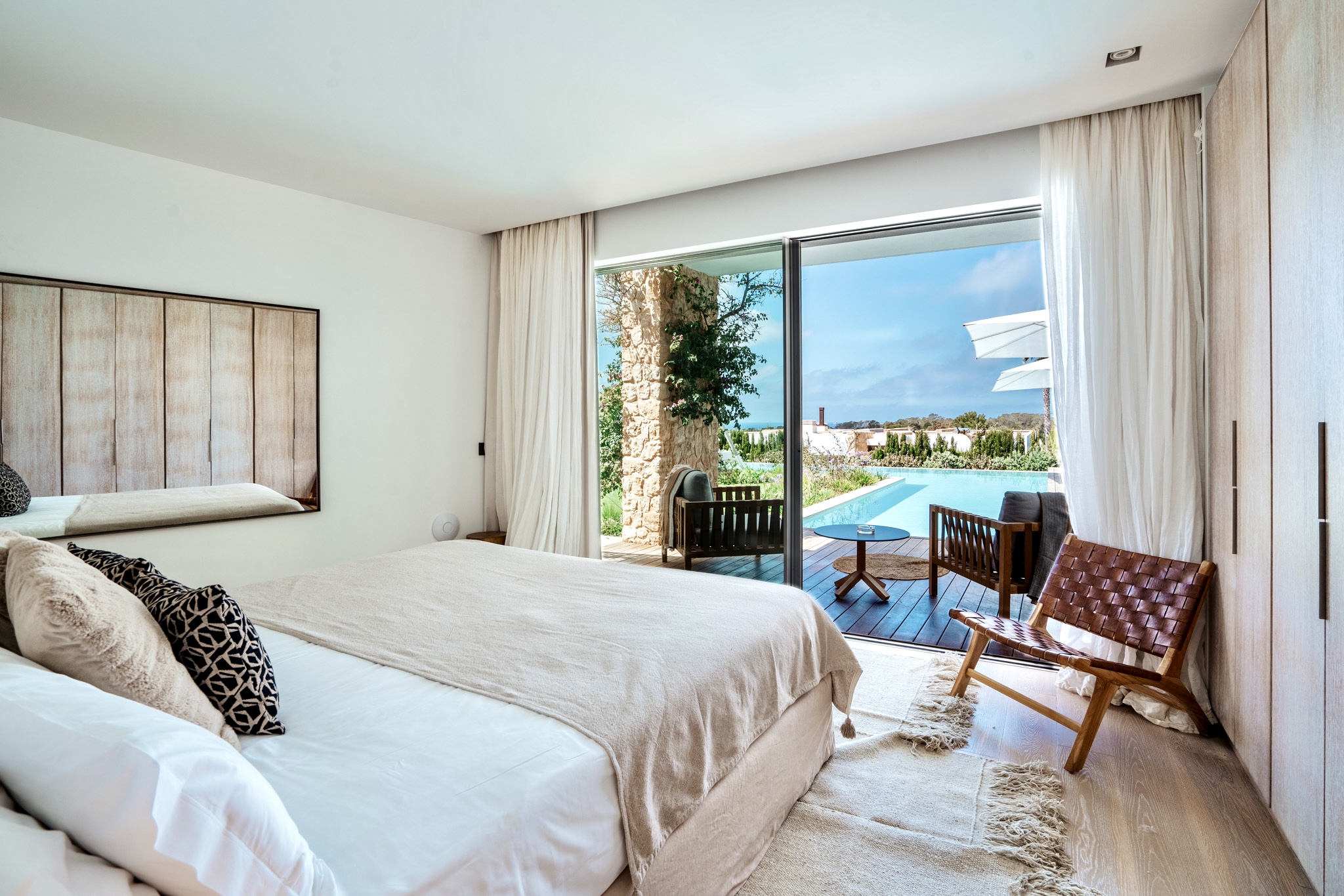 King-size double bed (41 m2) overlooking the garden and pool and with a sea view, it has its own private terrace ( 14m2) with luxury sofas by Roda. Features a local stone bathtub and walk in sky rain-shower, with the outlook onto aligned cypress trees. There is ample hanging space for clothes with a full wall of wardrobes.